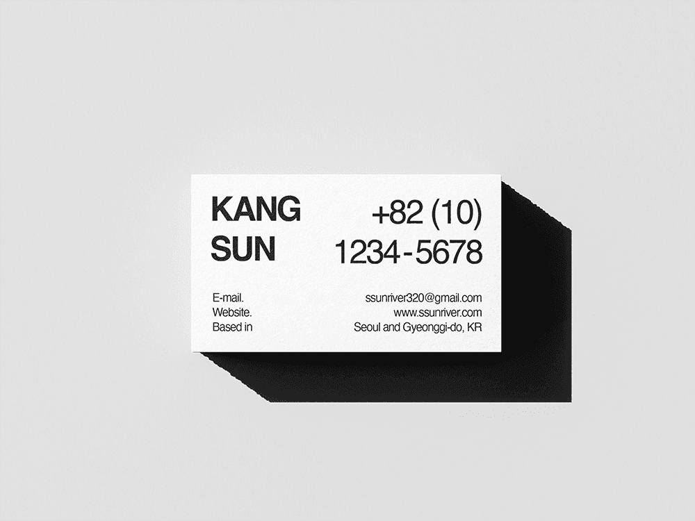 강선의 명함은 클래식한 톤에서 벗어나, 큼직한 타이포그래피와 정보 나열로 명함 규격을 채운 구성을 적용했습니다. 이는 UX/UI 프로덕트 디자이너 강선으로서의 디자인 스타일인 ‘깔끔하고 모던함’에서 영감을 받은 결과입니다.
